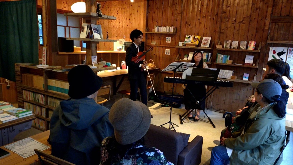 本に囲まれた空間でのピアノとバイオリンの演奏、来場者と本を通じた交流を通じ、